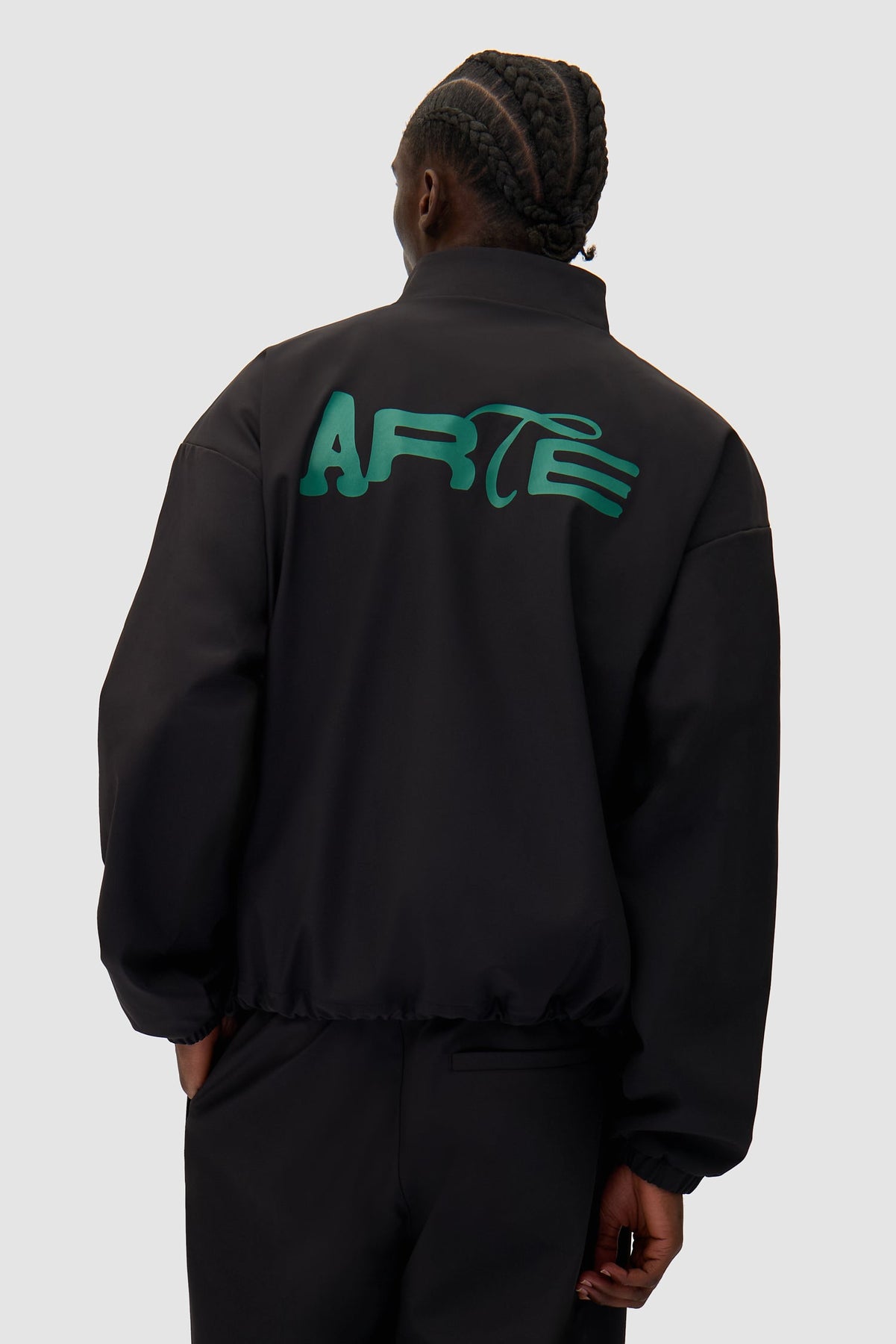 Crafted from polyester, the jacket offers both function and elevated style. Featuring a stand-up collar, front zip closure and adjustable drawstrings at the hem of the jacket, it locks in the heat while keeping you looking sharp. The jacket features a seasonal Arte logo printed in green across the back as well as a small logo on the left chest in green. Complete the look with the track pants.