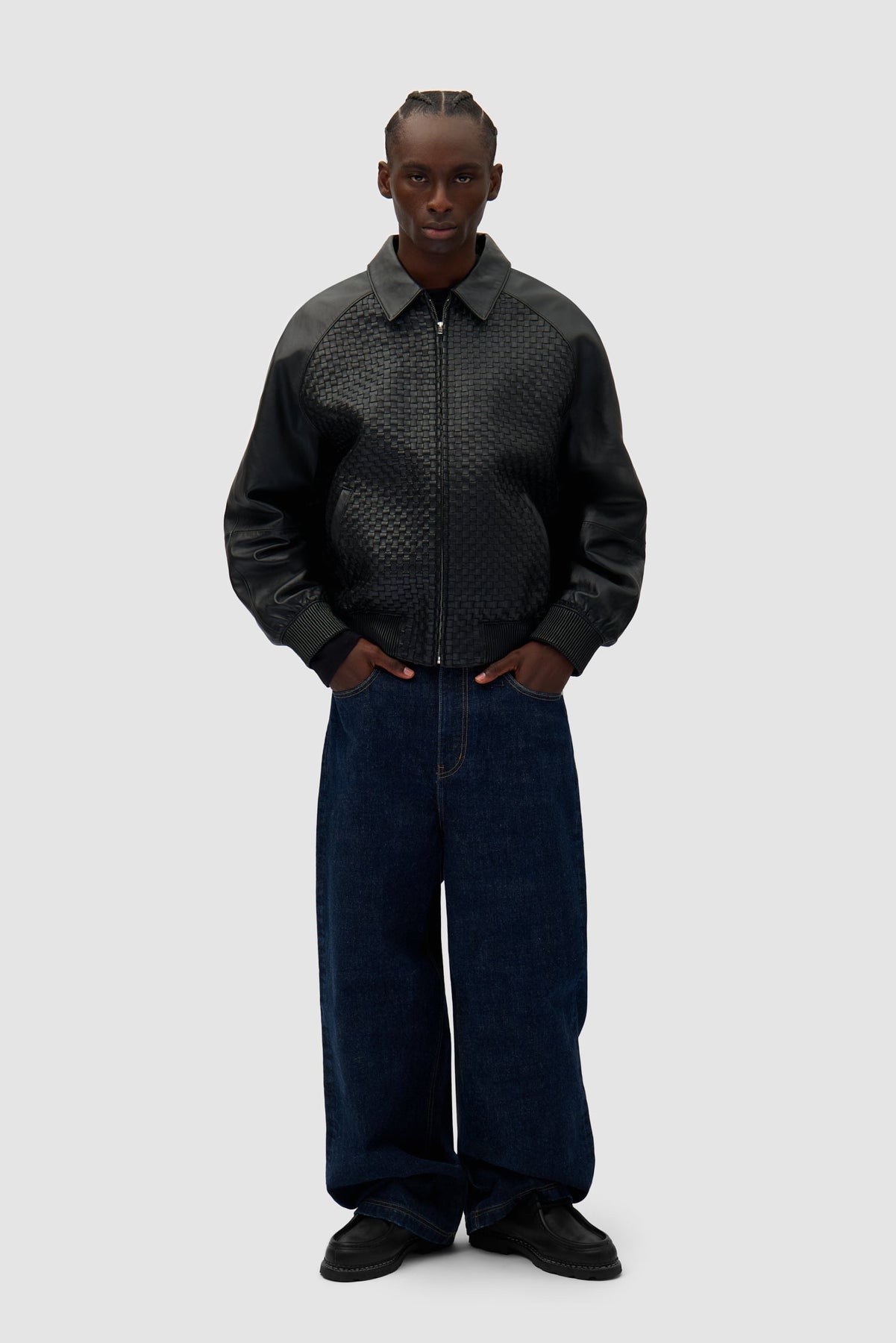 Crafted from premium leather, this black jacket is a statement piece and offers elevated style. The body of the jacket is made of a woven leather structure, completed with a full zip closure, two welt hand pockets at the lower front and elasticised leather cuffs and hem. The leather jacket features an embossed branded leather patch on the back at the neck.