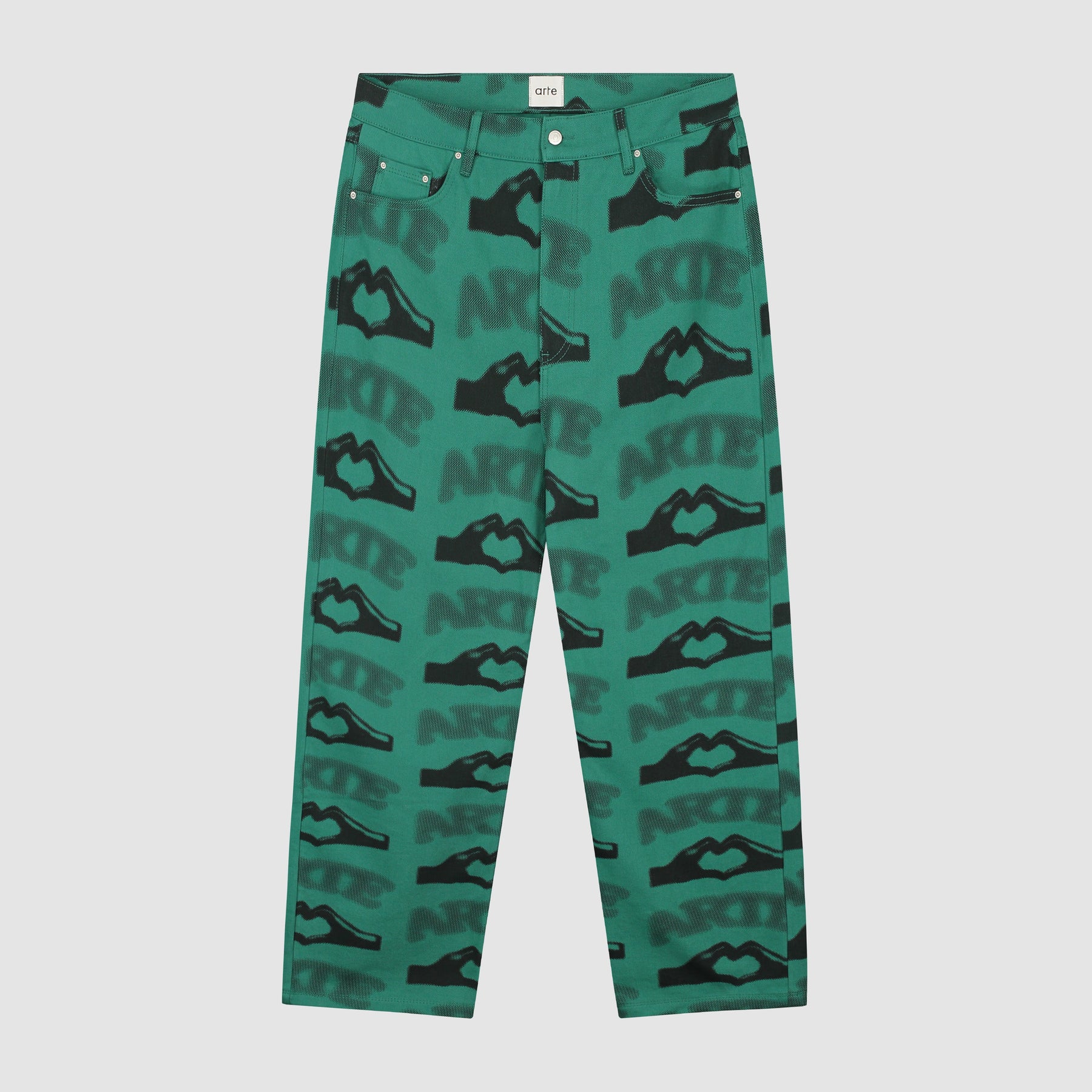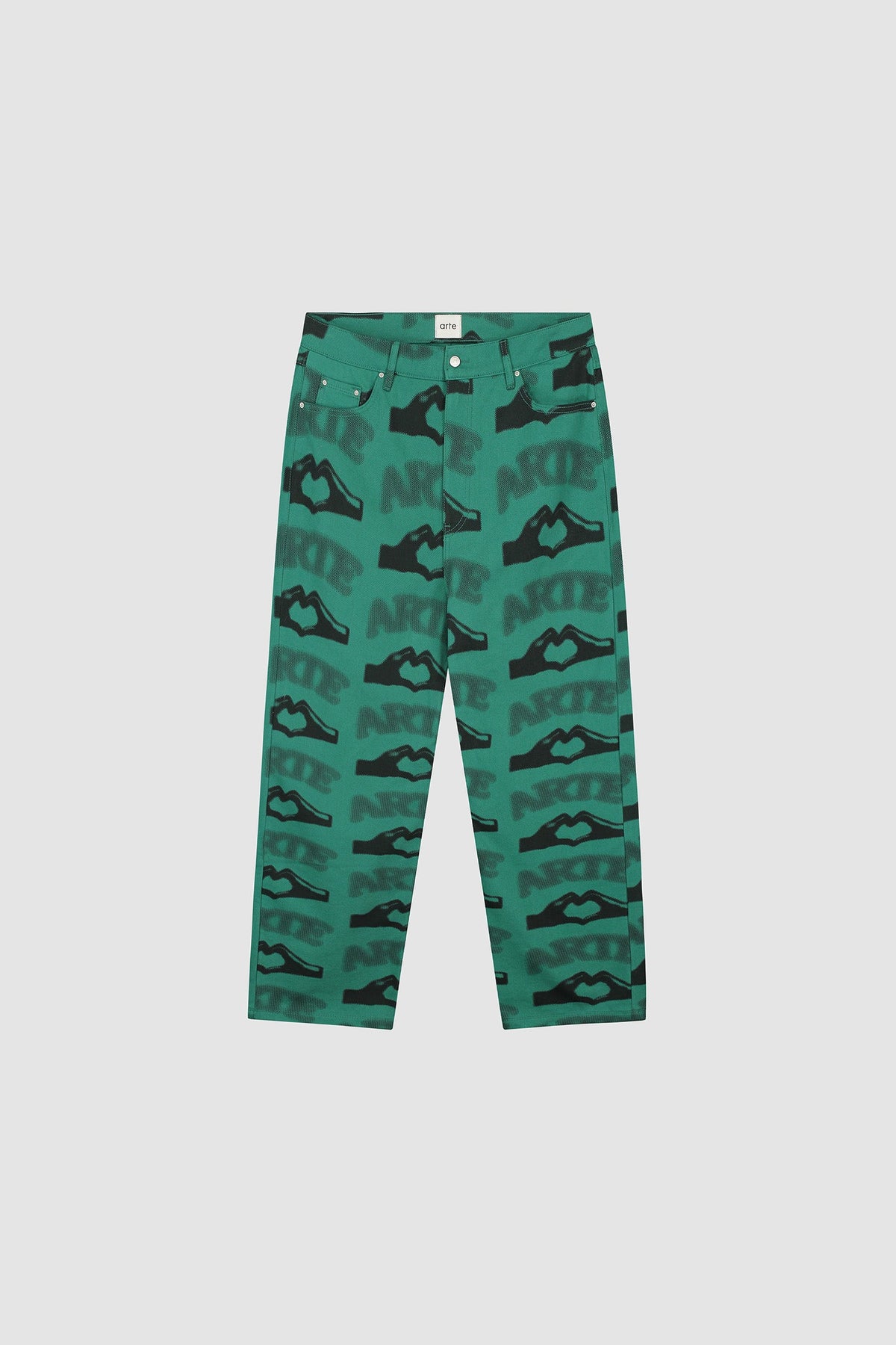 Made from premium cotton, the pants come in a classic 5-pocket style and have a relaxed slightly tapered fit. The green pants feature an all-over seasonal artwork in black. Complete the look with the matching Heart Printed jacket.