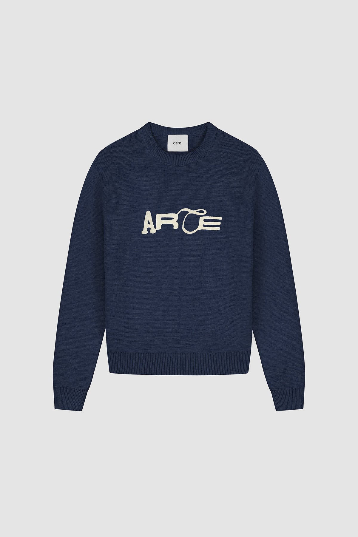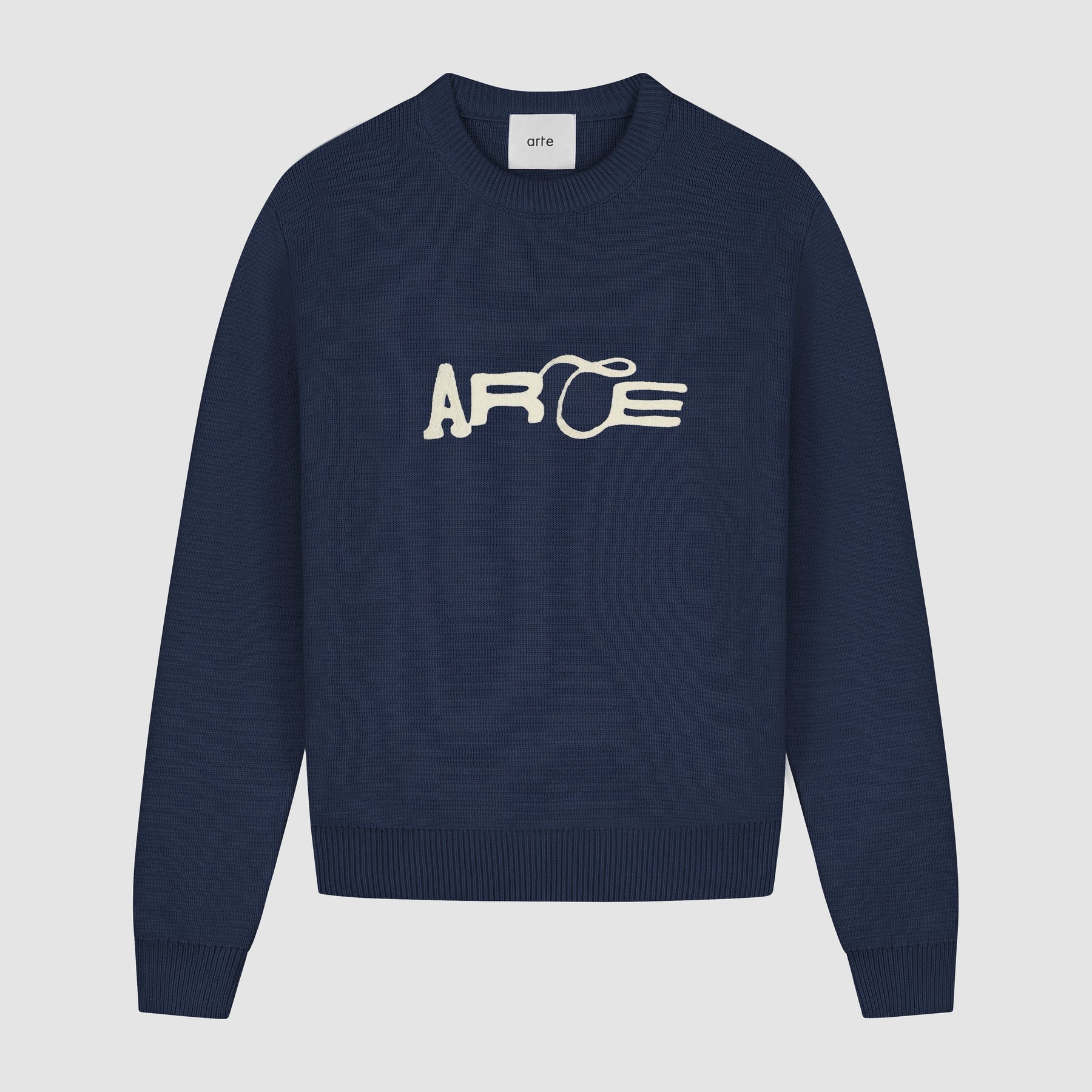 Made from heavyweight cotton, the knitted sweater comes in a navy colorway and has a regular fit. The sweater features a seasonal Arte logo that captures the theme of the collection embroidered in white across the chest.