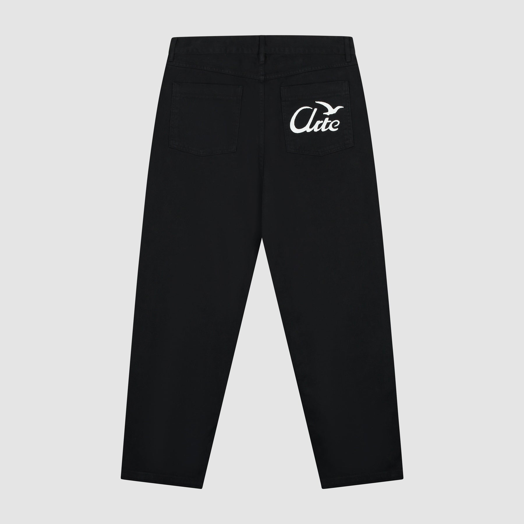 The trousers are an everyday pair of pants that feature an embroidered artwork that channels the theme of the collection on the right back pocket. They come in a classic 5-pocket style and have a relaxed, slightly tapered fit.
