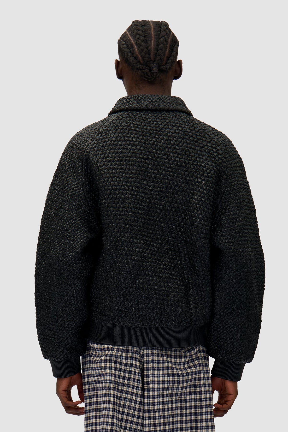 Crafted from premium leather, this black jacket is a statement piece and offers elevated style. The jacket is made of a woven leather structure, completed with a full zip closure, two welt hand pockets at the lower front and elasticised leather cuffs and hem. The leather jacket features a tonal embossed branded leather patch on the back at the neck.