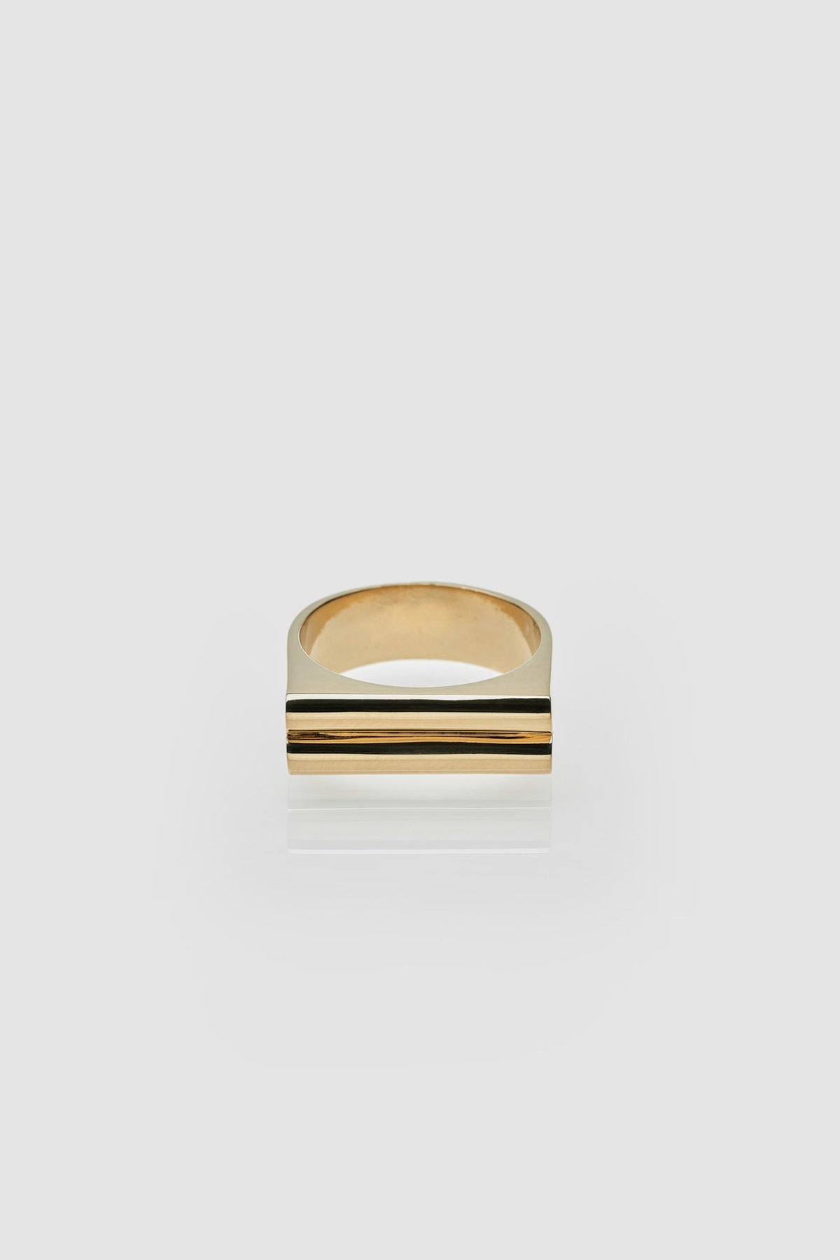 The Pelli Ring is shaped by two round tubes, creating an angular surface.Handcrafted from 18 karat gold plated sterling silver, the ring is a sculptural take on a classic band. The goldpiece is unisex and made for both men and women to wear.